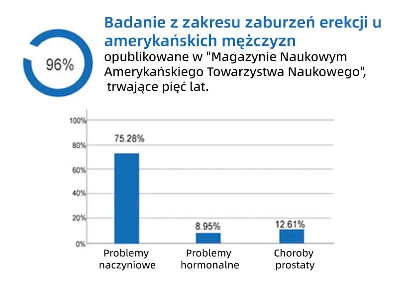 Después de un exhaustivo estudio longitudinal de cinco años, el American Journal of Science informó que las principales causas de disfunción eréctil (DE) en los hombres estadounidenses son principalmente problemas vasculares, desequilibrios hormonales y enfermedades de la próstata. Los problemas vasculares representan el 75,28%, los problemas endocrinos el 8,95% y las enfermedades de la próstata el 12,61%. Las relaciones sexuales repetidas también son comunes entre pacientes con disfunción eréctil.