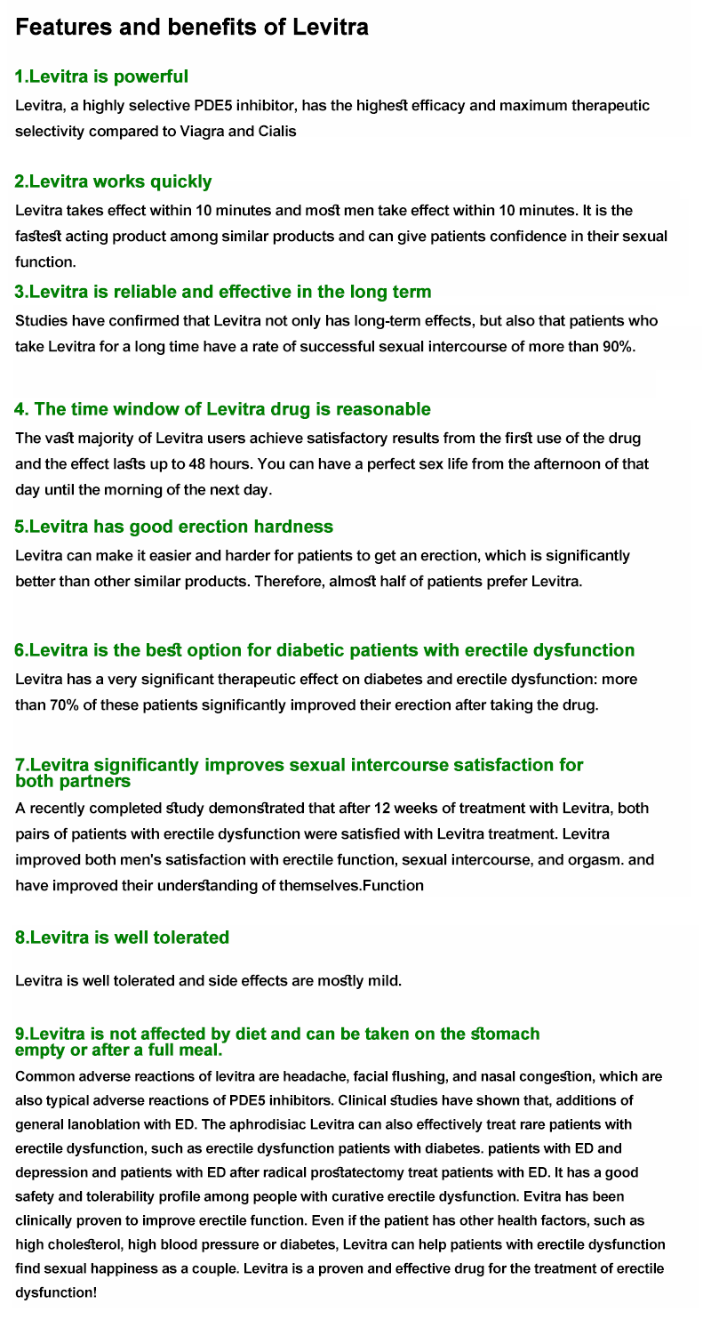 [Levitra] ist zuverlässig und effektiv auf lange Sicht. Zusätzlich zur Wirkung von 48-Stunden können Patienten, die Levitra für eine lange Zeit einnehmen, Impotenz, vorzeitige Ejakulation, Prostata und andere Krankheiten effektiv lindern.